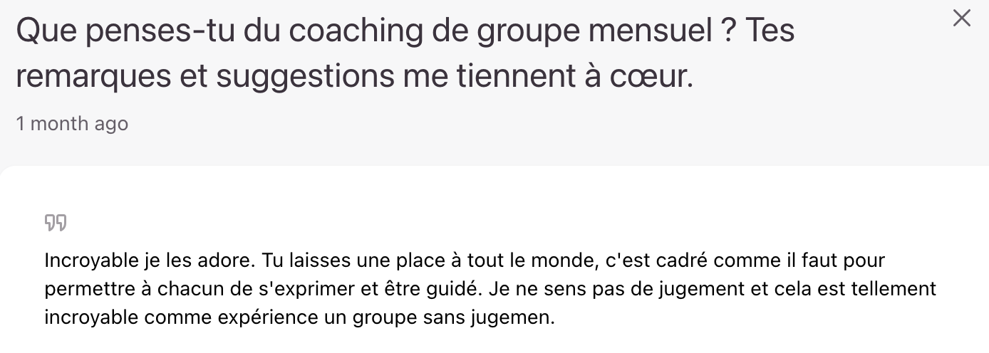 Comme mentionné plus haut, les séances de coaching de groupe sont enregistrées et postées sur la plateforme. Tu peux donc m'envoyer tes questions en avance et j'y répondrai lors de la séance suivante.